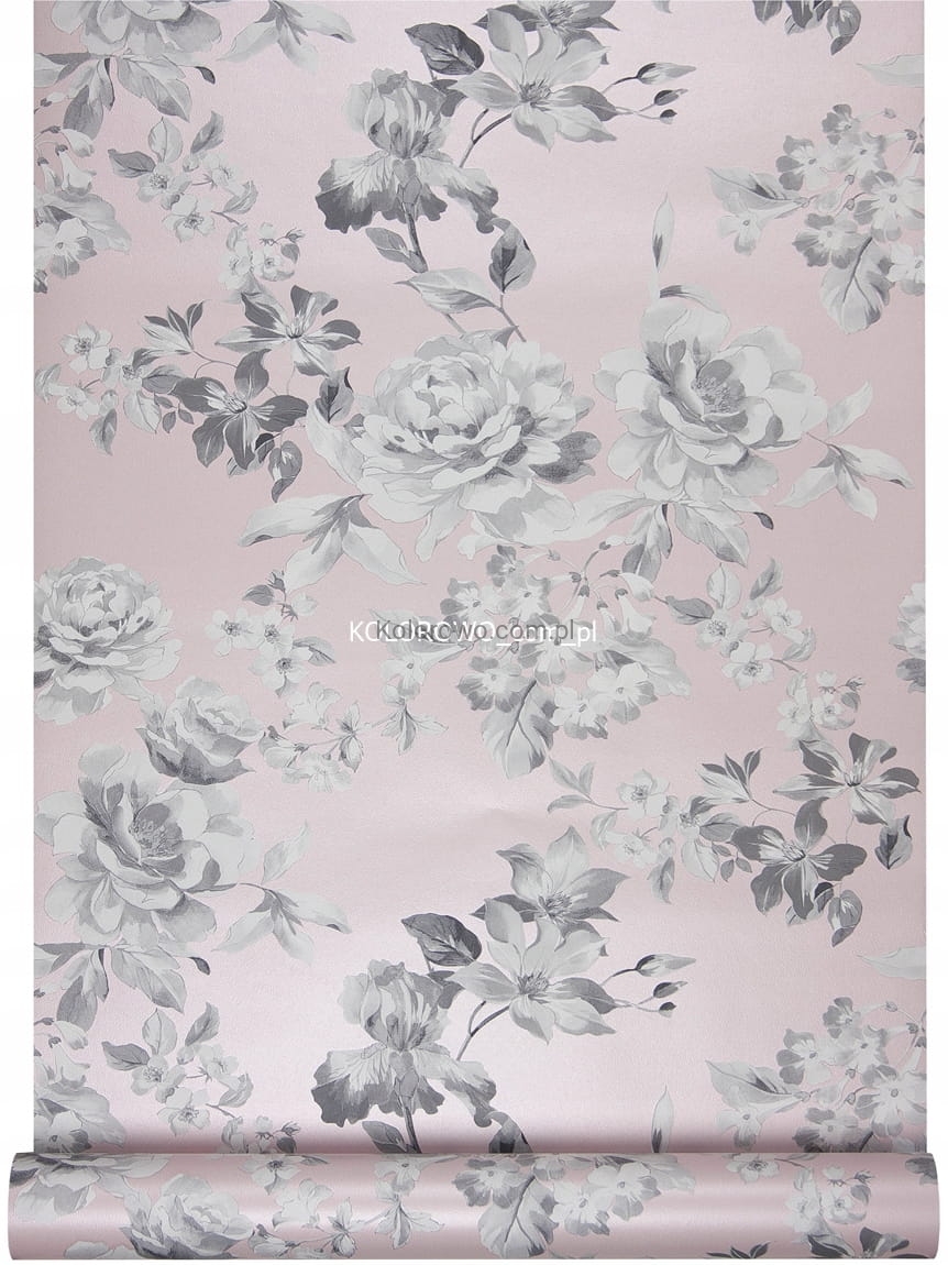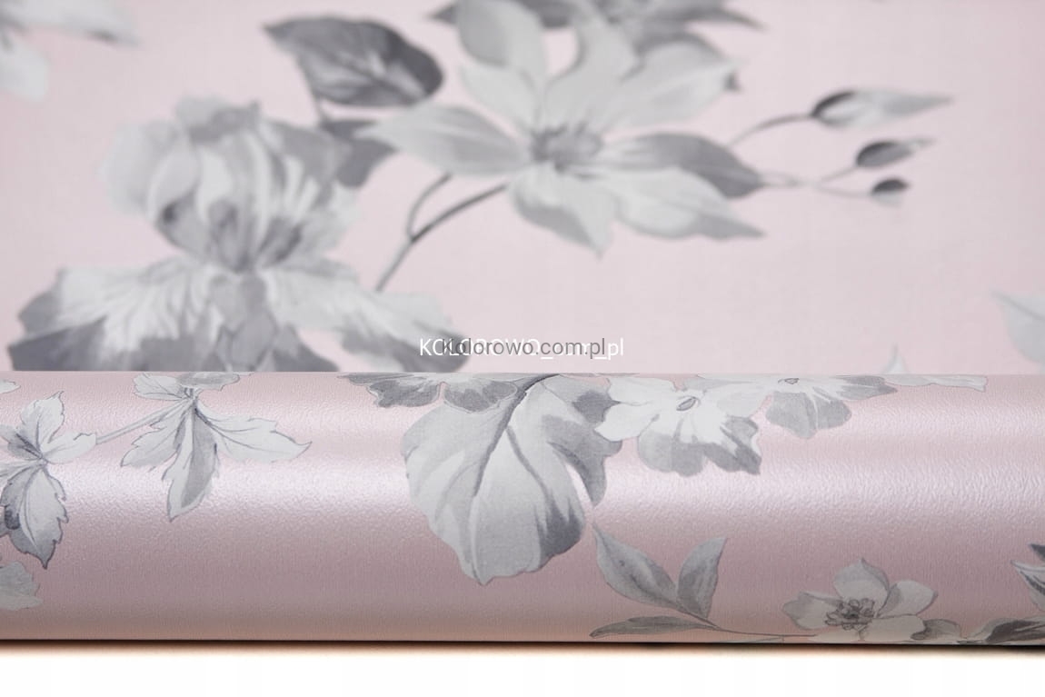 - tło tapety jest różowe, natomiast wzór posiada odcienie szarości oraz bieli
