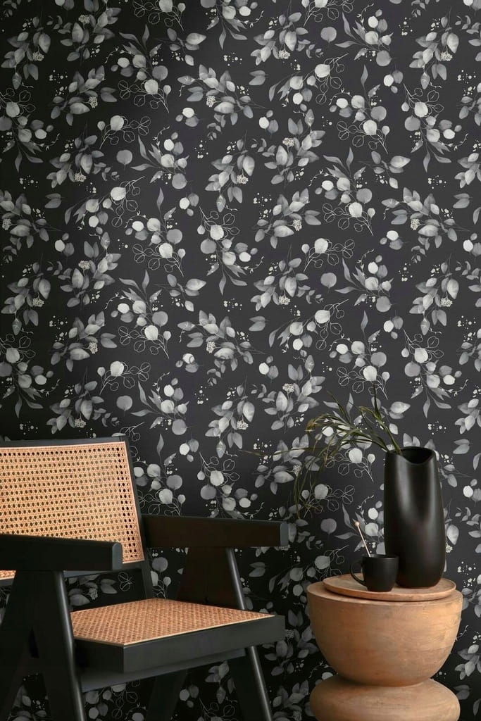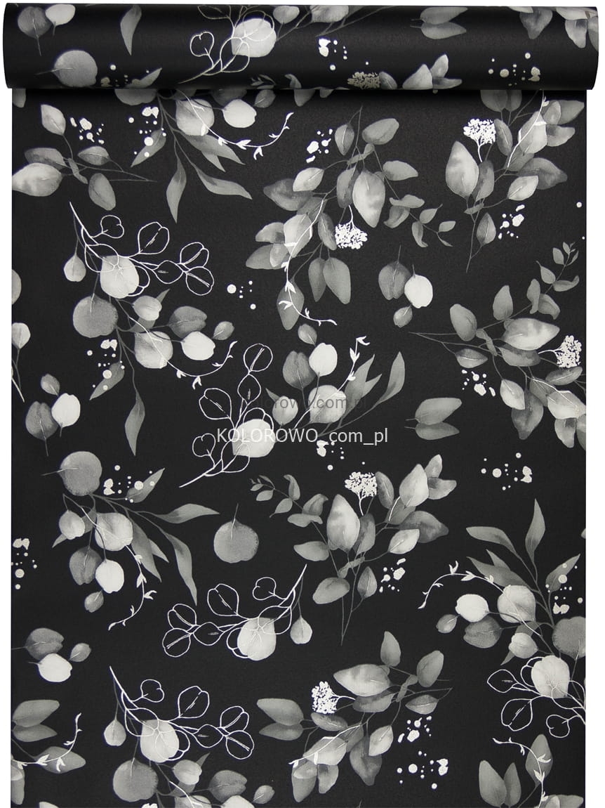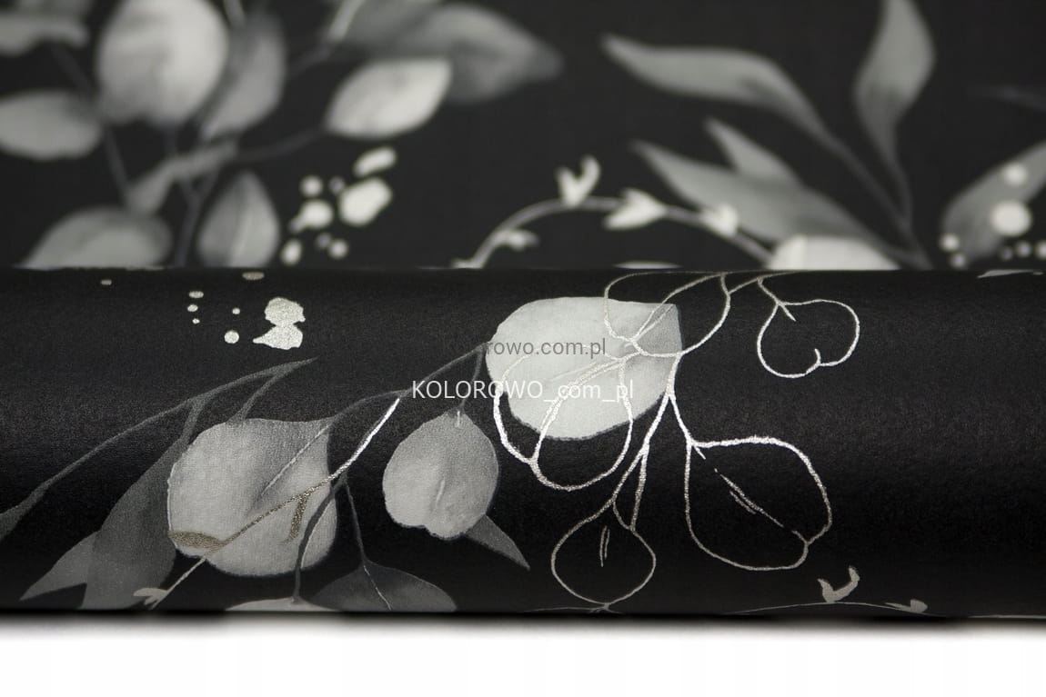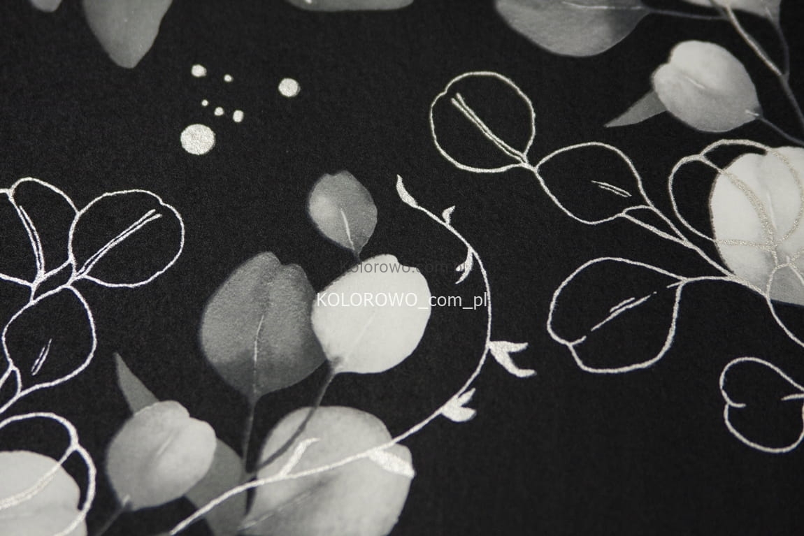 - Modny drobny wzór roślinny w liście, gałązki, utrzymane w czarno szarej tonacji