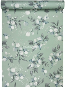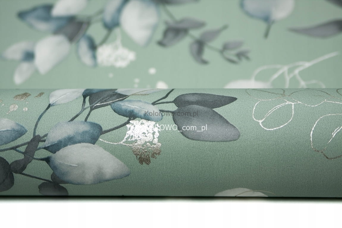 - modny wzór i kolorystyka propozycja tapety z motywem drobnych gałązek, z listkami w odcieniach białym i miętowym, dodatkowo rozświetlona delikatną srebrną kreską