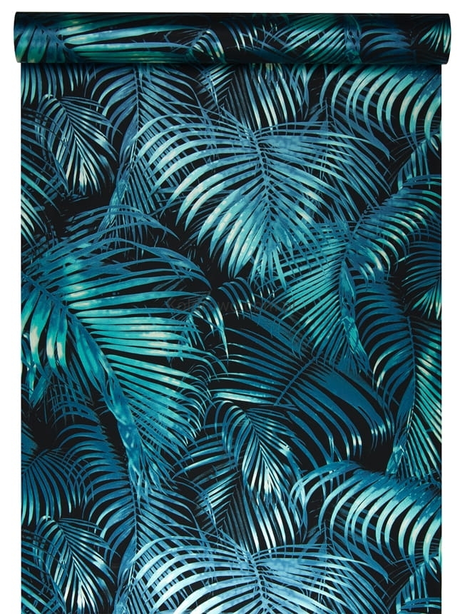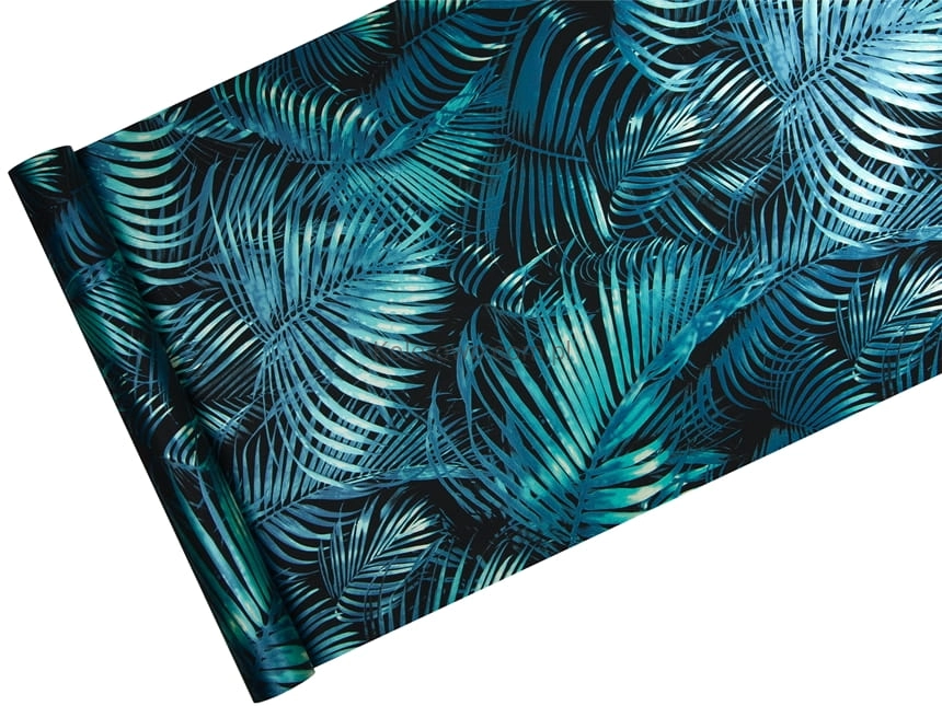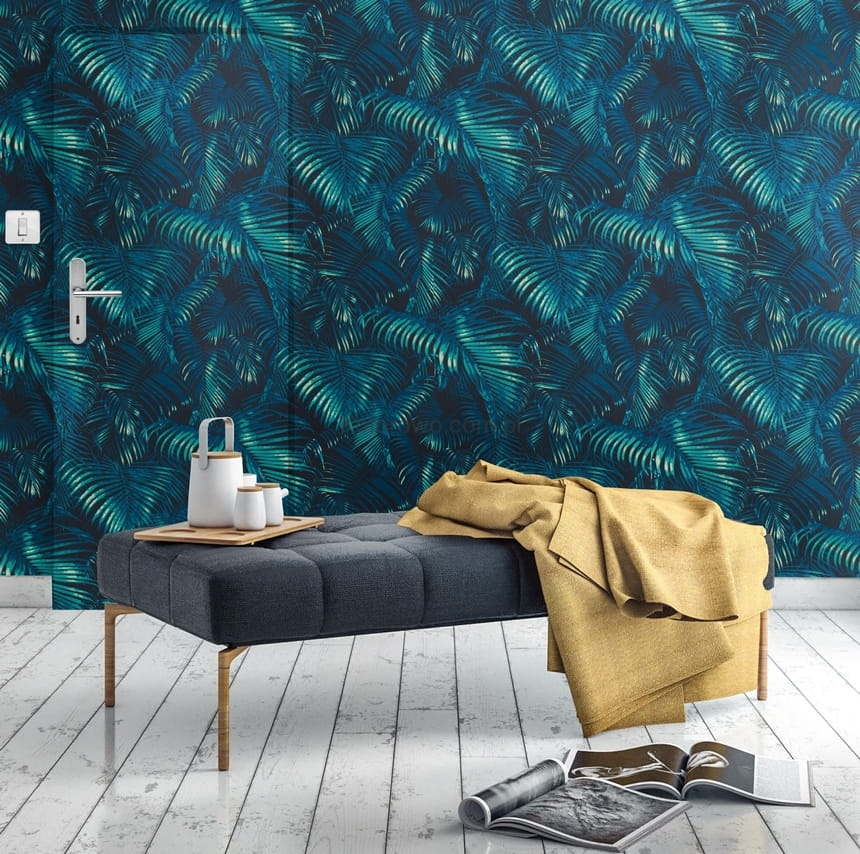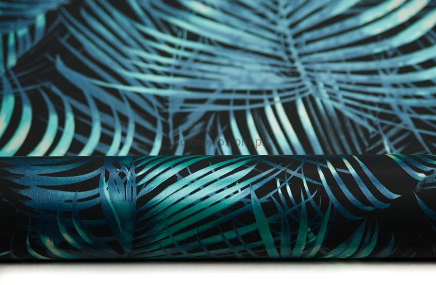 Wzór tapety - metalicznie połyskujące liście palmy, silny akcent we wnętrzu.