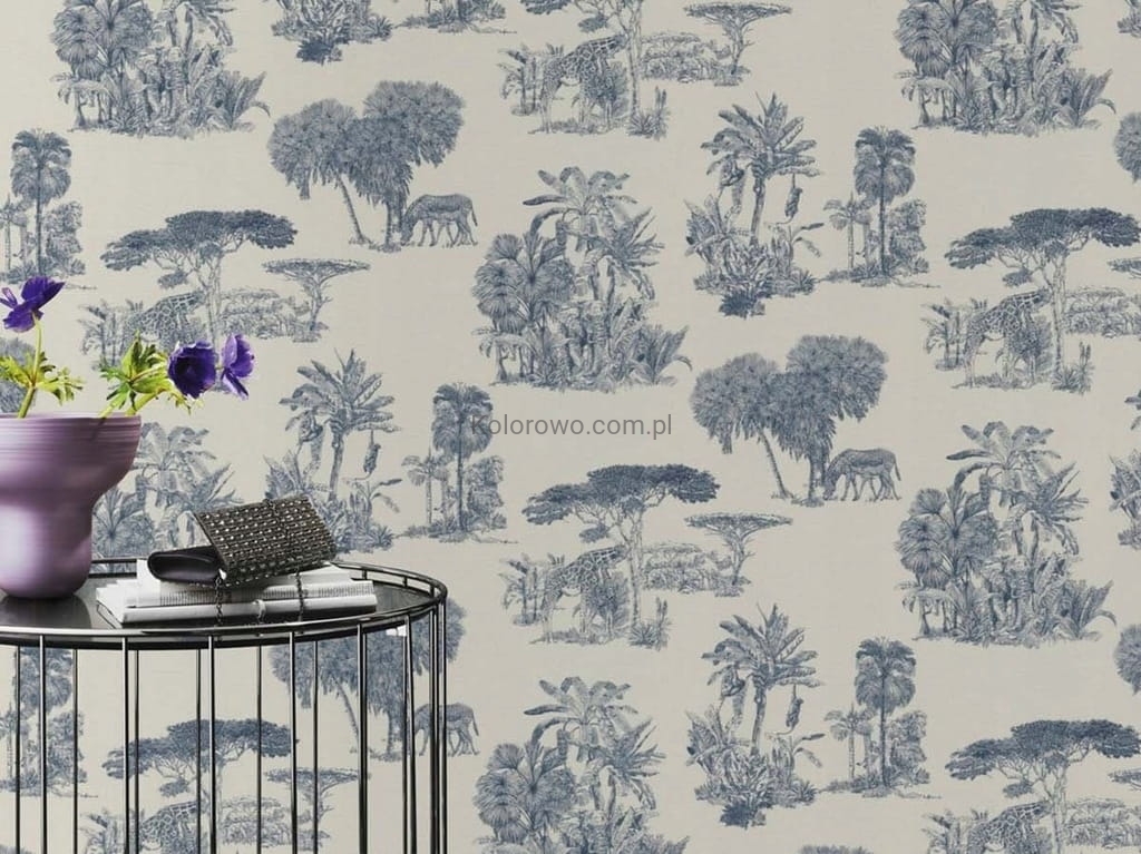 - tapeta z motywami egzotycznymi - palmy, lwy żyrafy.